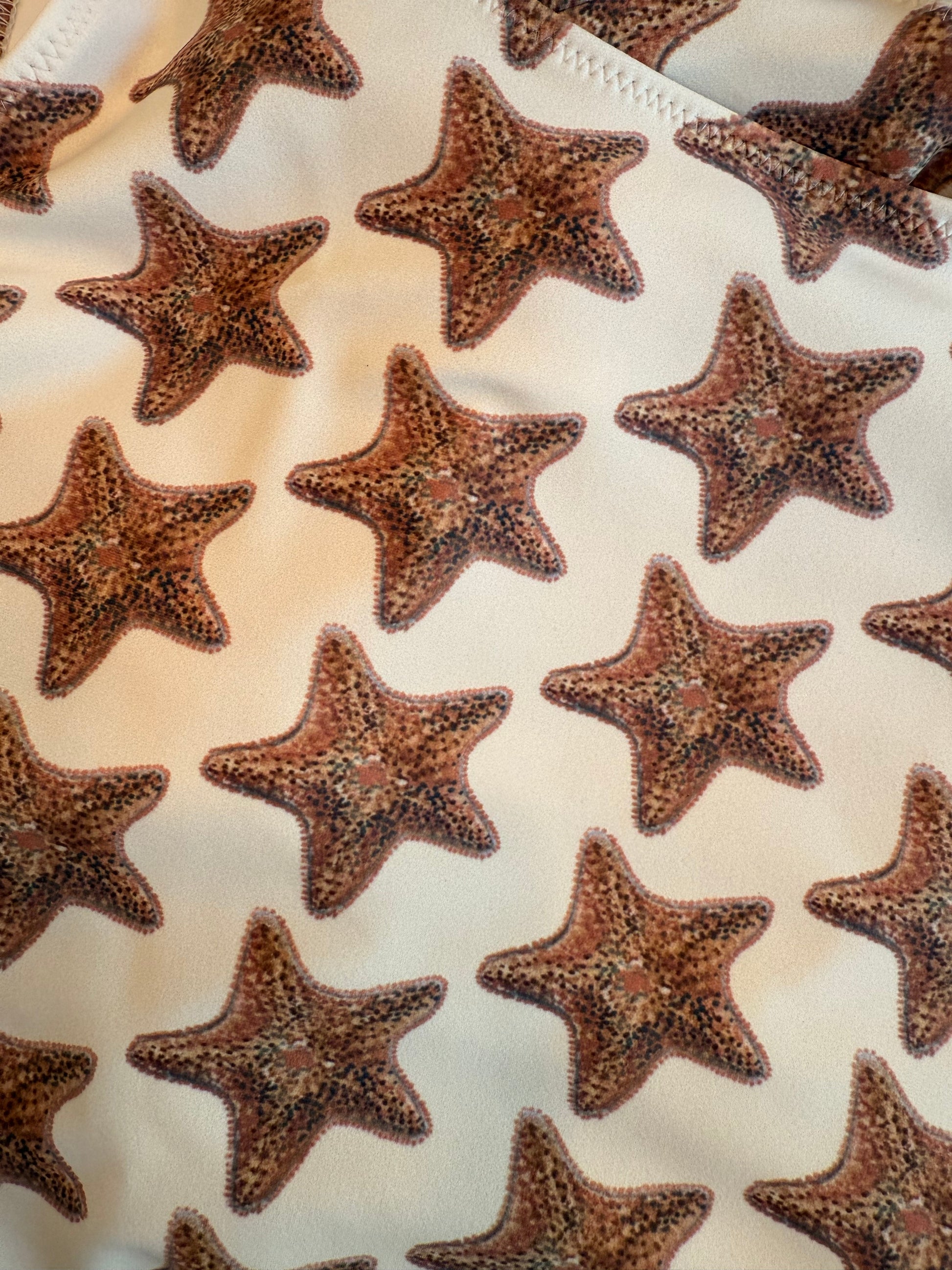 Made to order watercolour cushion starfish swimsuit. Cushion starfish on a lemon background with whits stitching ⭐️