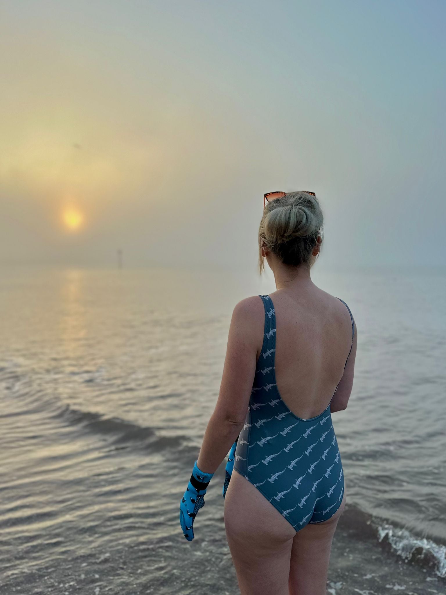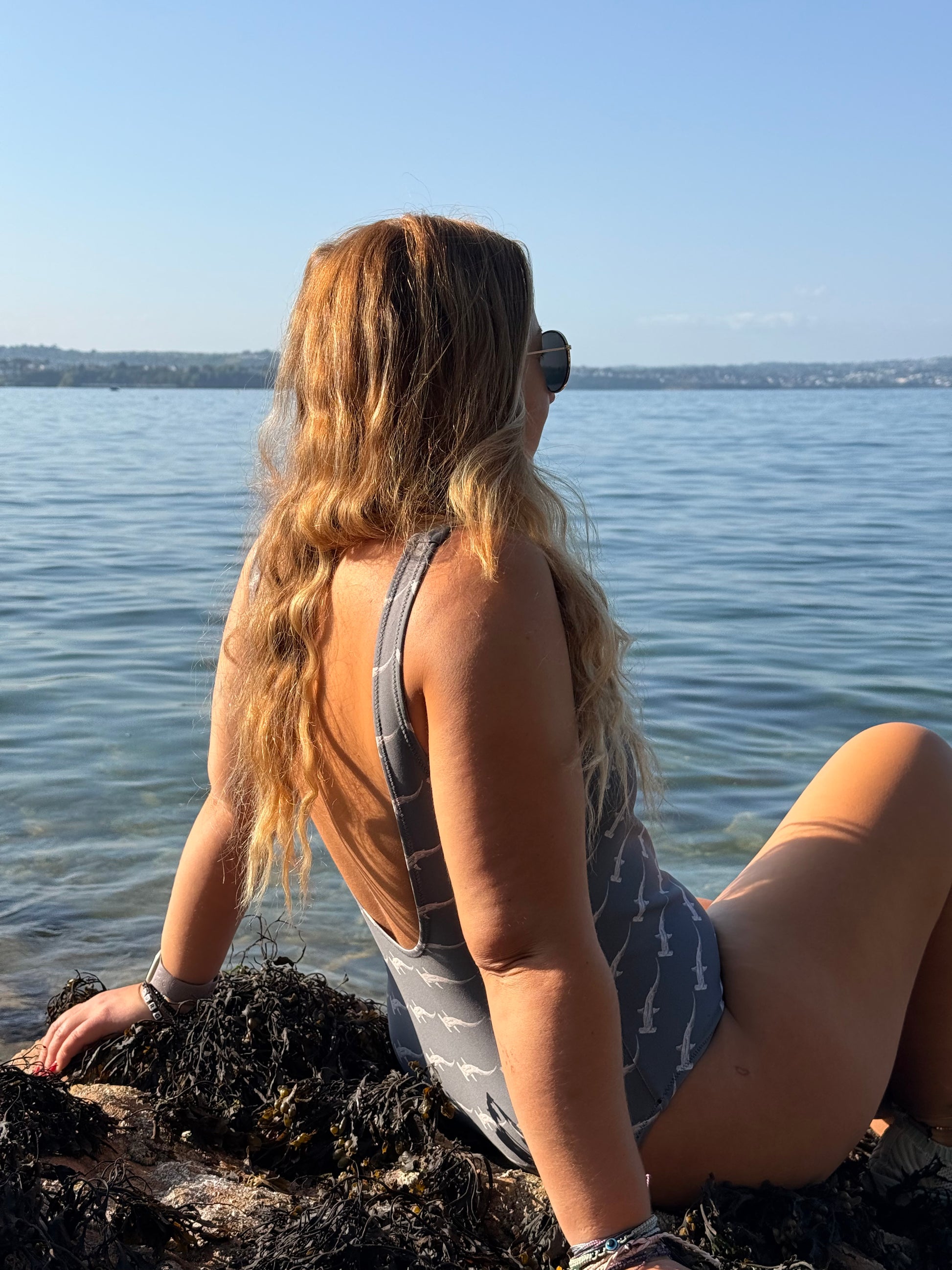 Made to order watercolour hammerhead shark swimsuit. Hammerhead sharks on a grey background with black stitching 🦈