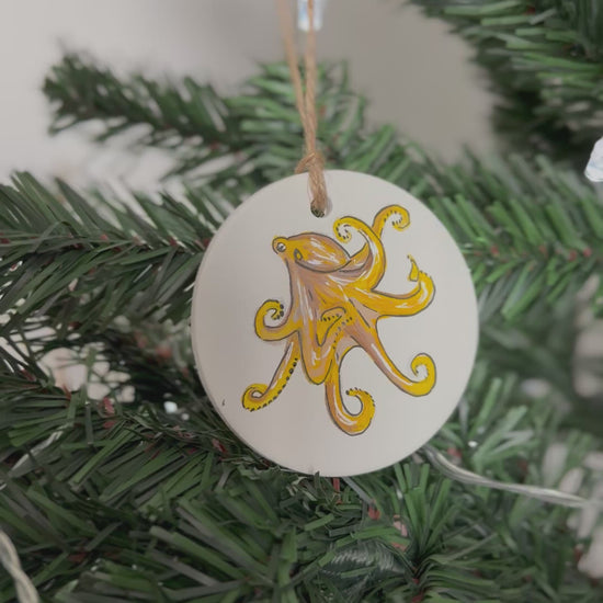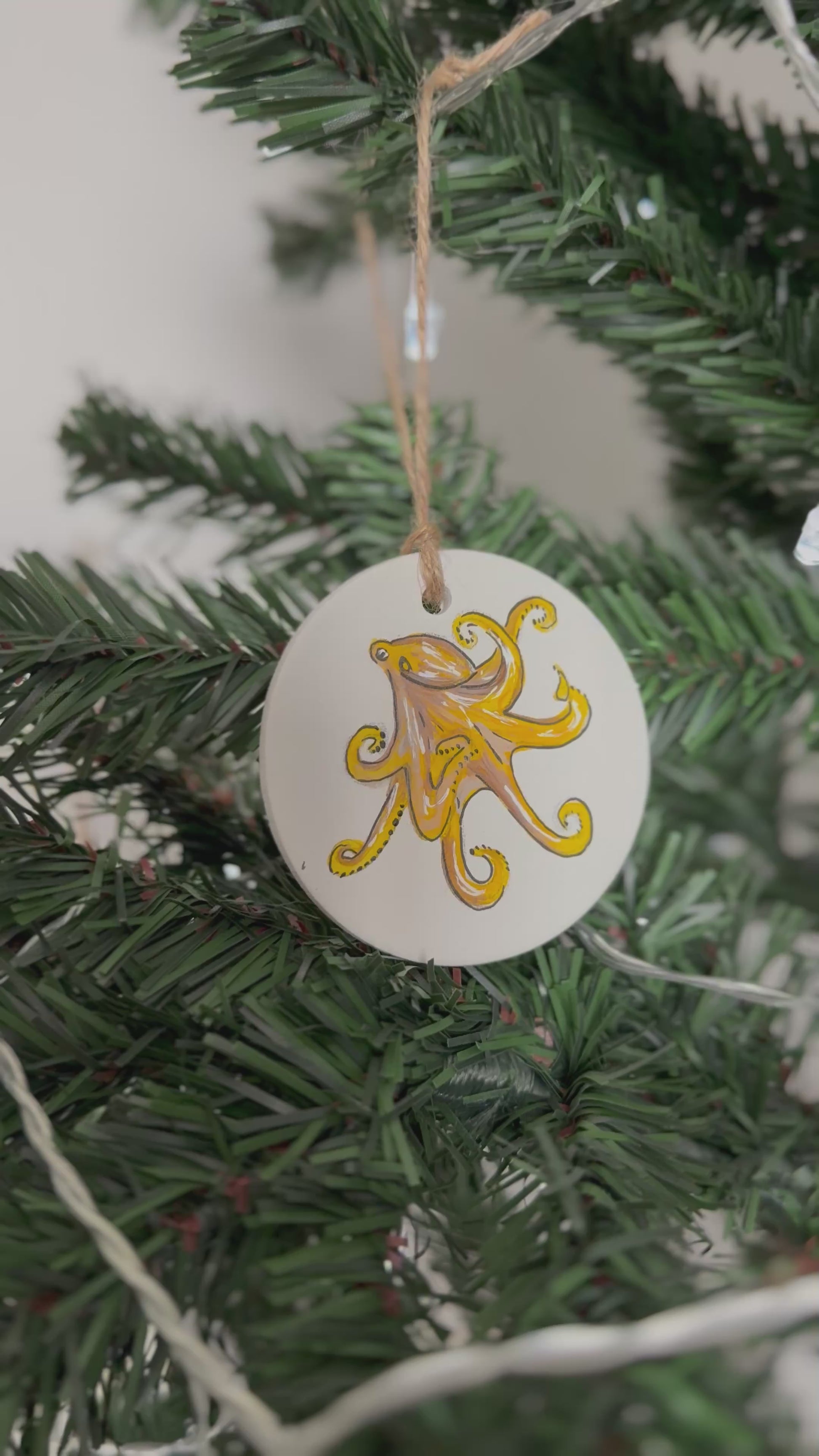 The ceramic discs are painted with marine life animals on them. Perfect for hanging on your Christmas tree, decorating a coastal-themed home, or gifting to an ocean lover.