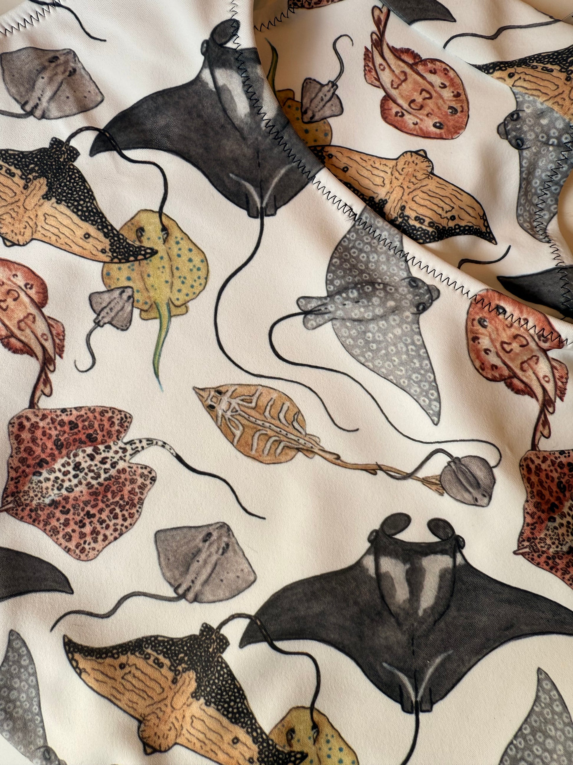 Made to order watercolour ray migration swimsuit. Ray migration on a white background with black stitching ⭐️
